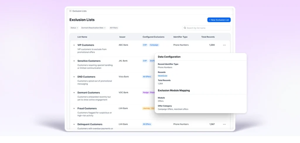 A unified engine to centrally manage all customer exclusion lists across various offer categories. Eliminate duplicate uploads, fragmented rules, and risky mismatches. Secure, PII-safe, and fully controlled by banks.