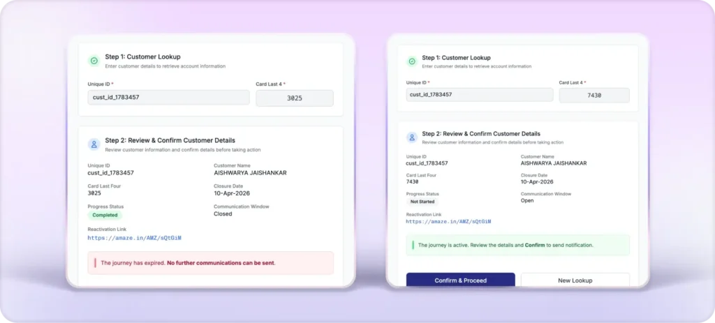 Customer support teams can now trigger in real time directly during live customer interactions. The CSM Assist Dashboard brings together customer lookup, journey validation, system-driven next-step guidance, and controlled communication triggering into a single interface. The result: faster resolution and higher in-call conversion.
