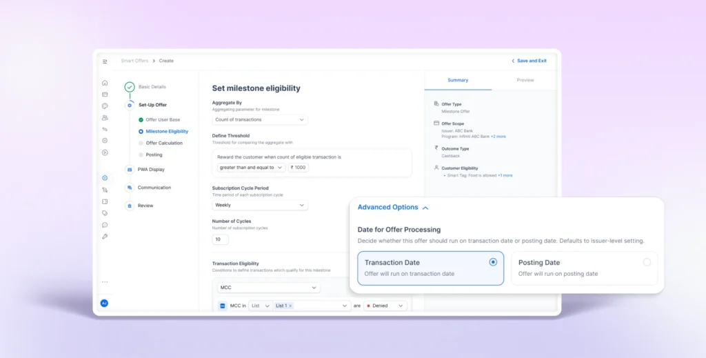 Banks can now control which date is used to evaluate credit card benefits, either the transaction date or the posting (settlement) date. A default evaluation date can be set at the issuer level, with the flexibility to override it for specific offers when required. This ensures benefit logic aligns cleanly with internal accounting, settlement workflows, and customer expectations.